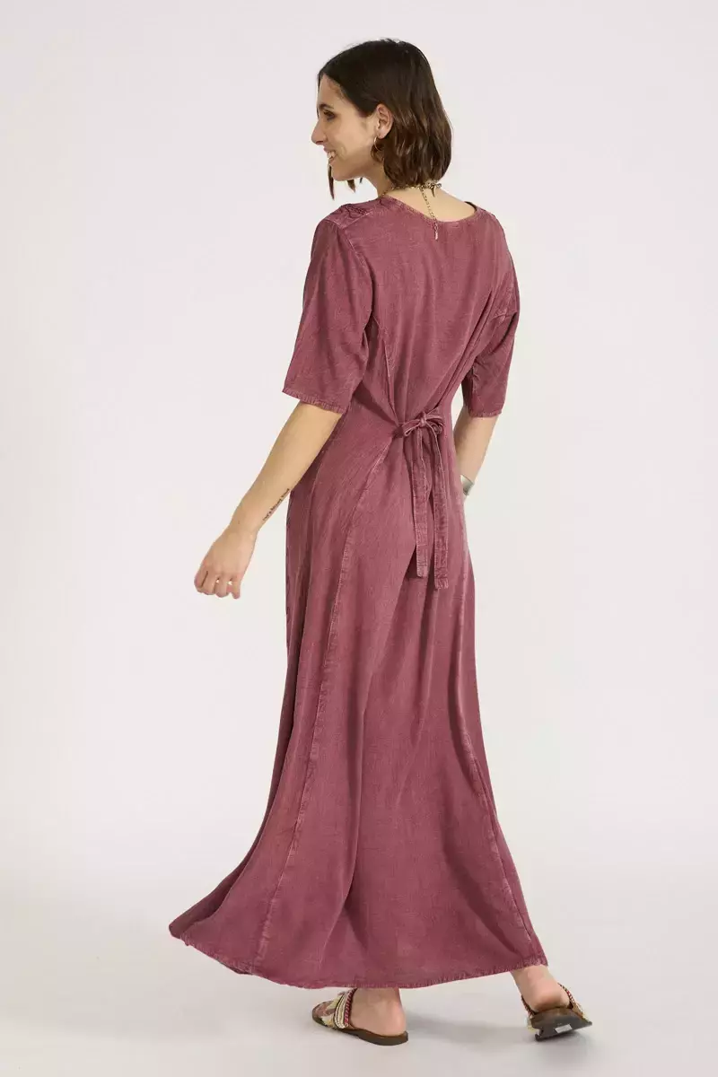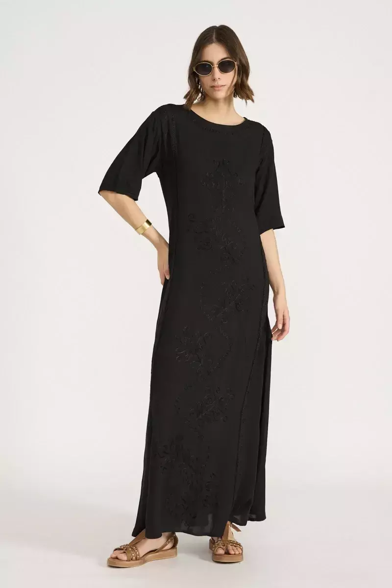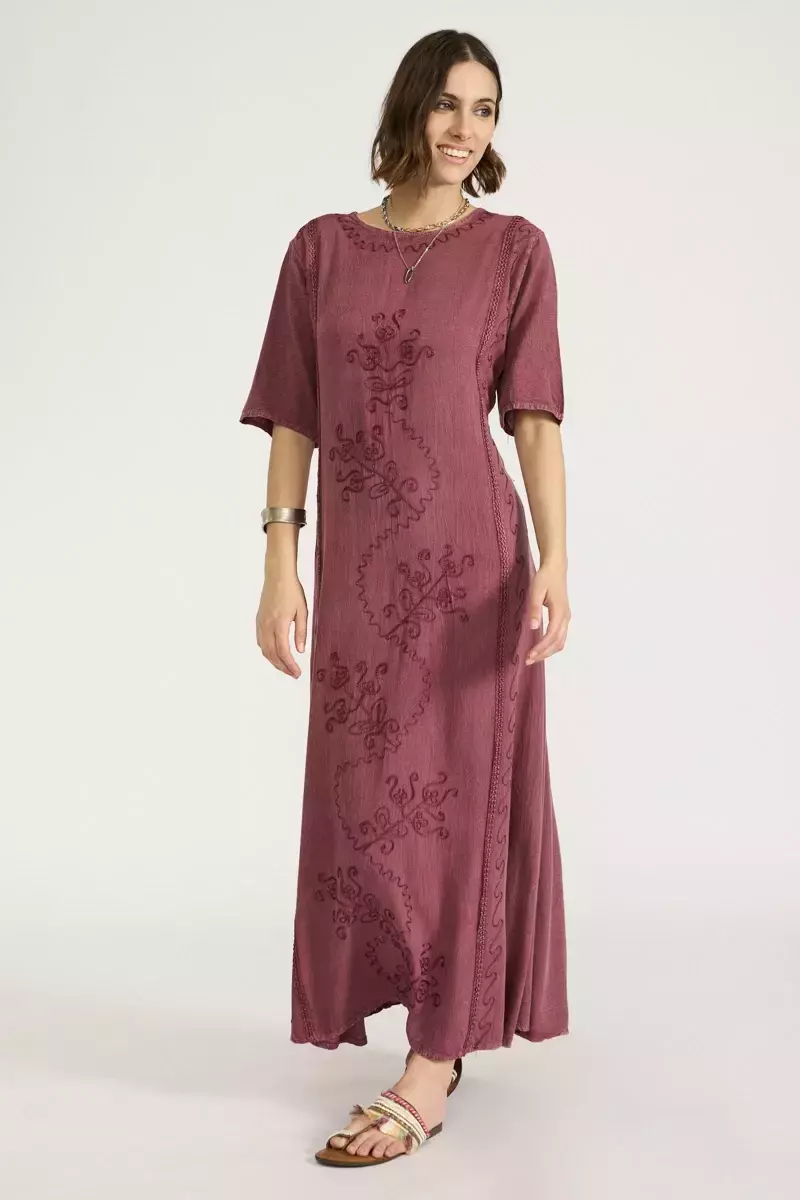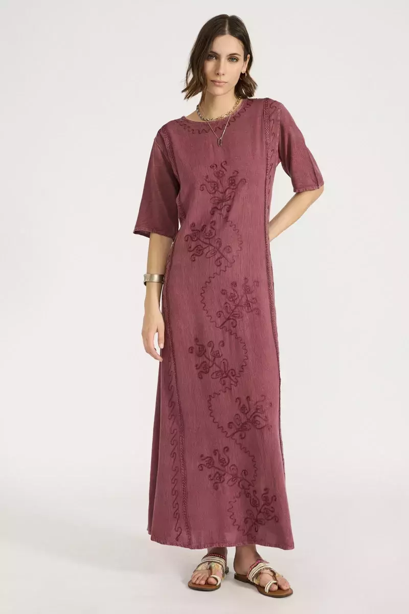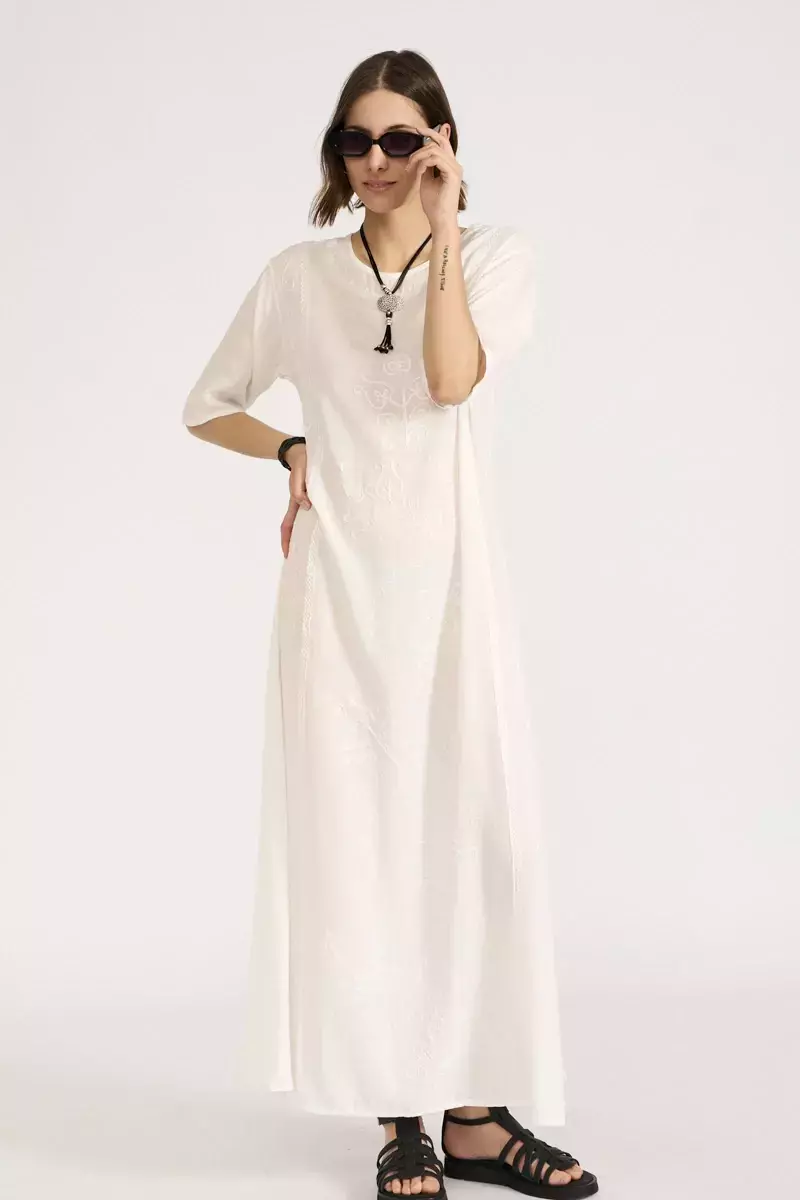Vestido de algodón escote redondo de mangas cortas. Modelo recto bordado con hilos de seda al tono en la totalidad del delantero, con lazos a la cintura para ajustar. Prenda confeccionada en India. La modelo usa talle S. Medidas talle S: Largo total: 135 cm / Contorno de busto: 100 cm / Ancho de hombro: 10 cm / Largo de manga: 26 cm.